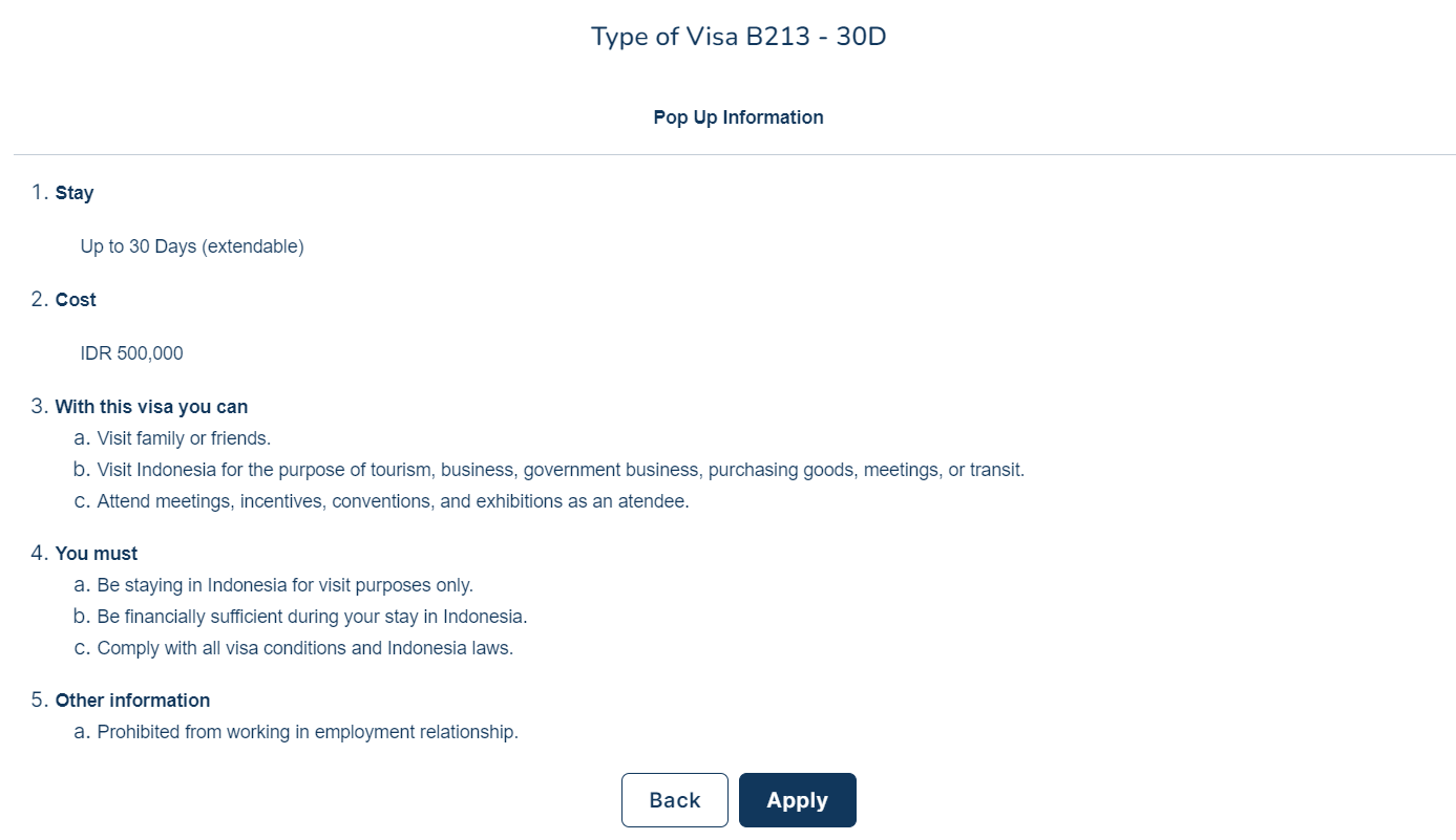 비자 가격은 IDR 500,000 입니다. Apply를 클릭합니다.
