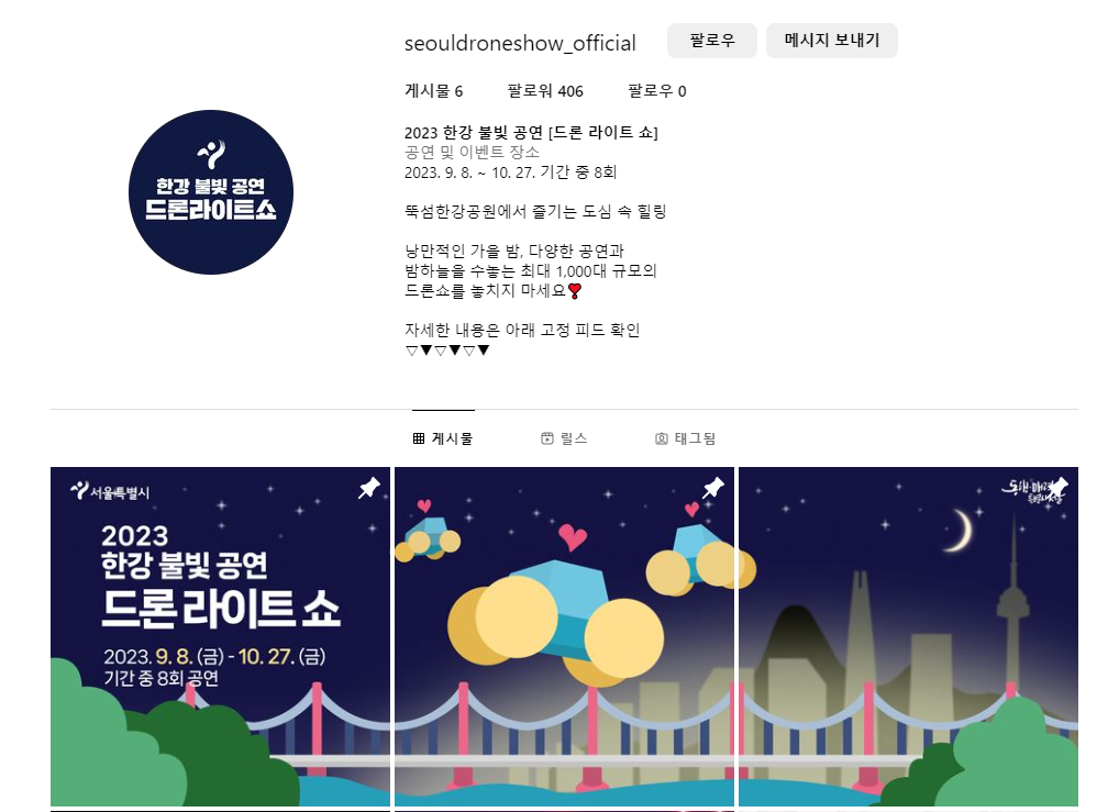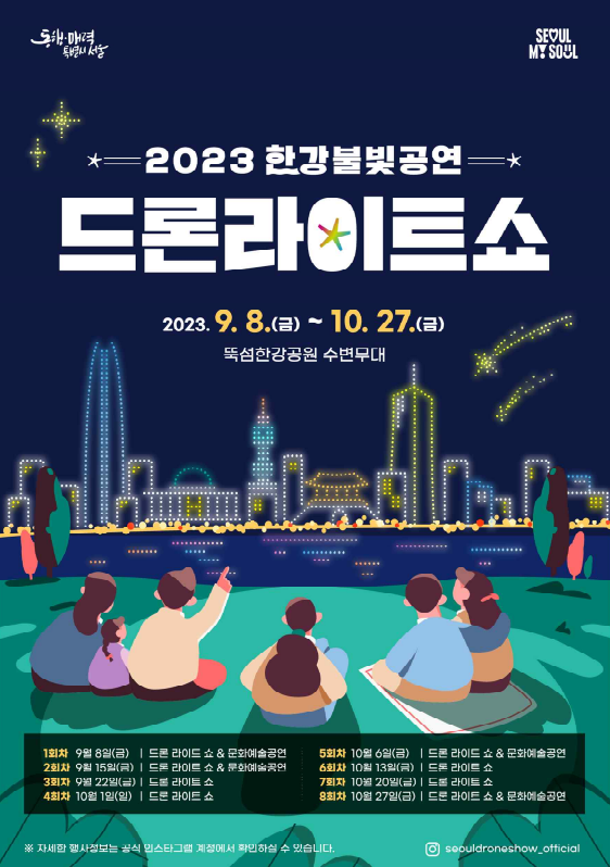 공연 관련된 자세한 내용은 인스타그램(@seouldroneshow_official) 또는 다산콜센터(☎120)에서 확인하실 수 있습니다.