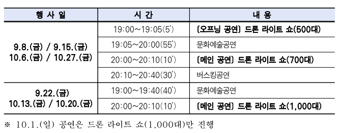 - 4차 공연 : 10.1(일) : 1,000대의 드론 라이트쇼가 펼쳐질 가장 화려할 공연입니다.
