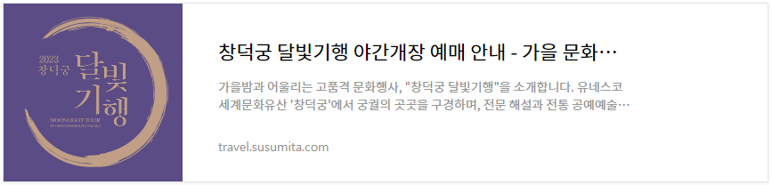 | 창덕궁 달빛기행 야간개장 예매 안내 - 가을 문화축제 추천 / 고궁 행사 (0) | 2023.09.02 |