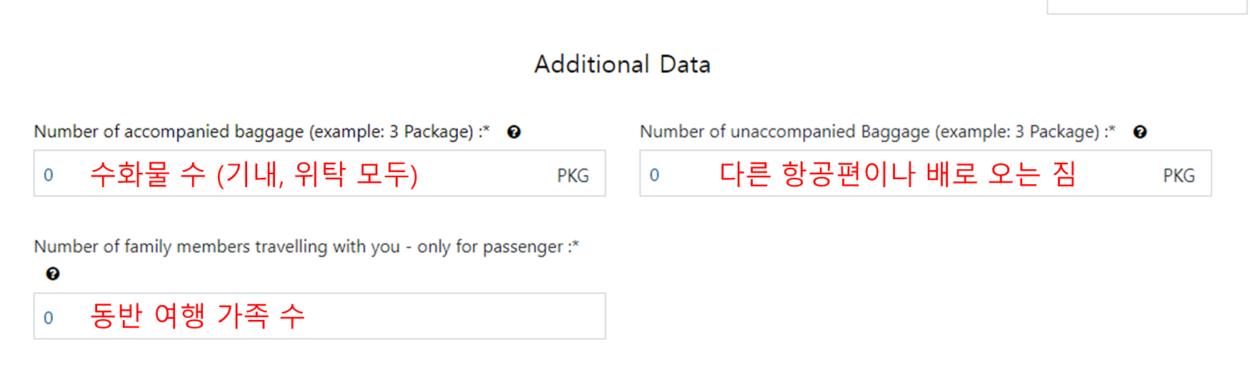 수화물 수와 동반 여행 가족 수를 입력합니다.
