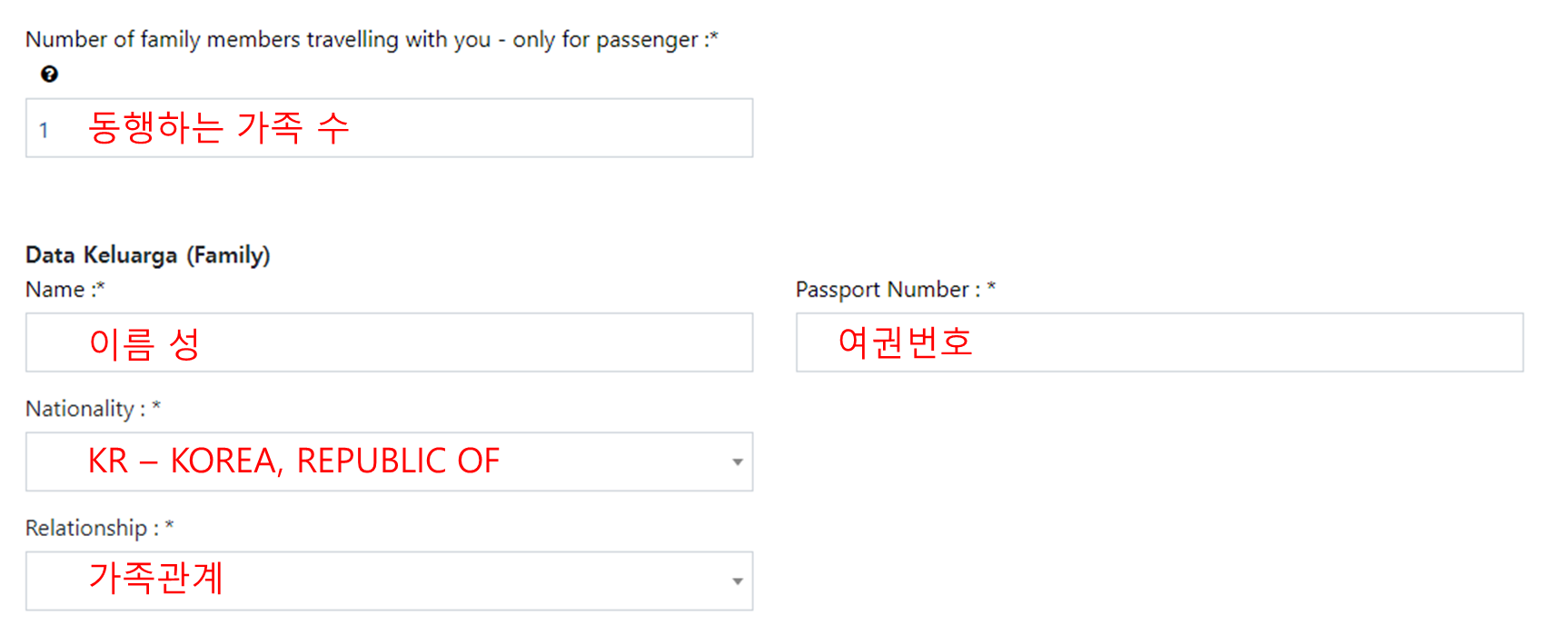 여권번호와 국적, 가족관계 등 간단한 인적사항을 적어줍니다.