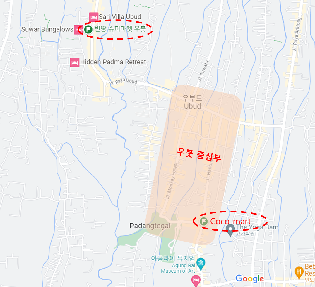 코코마켓 보다 빈땅마켓이 대체로 더 저렴합니다. 빈땅마켓이 우붓 중심부에서 거리는 조금 있습니다.