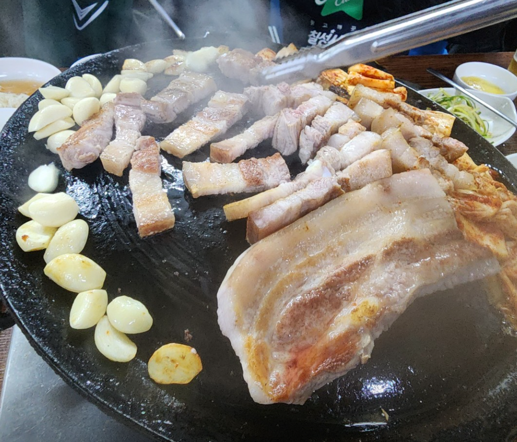 삼겹살과 김치전골이 주 메뉴입니다. 삼겹살은 16,000원, 김치전골은 9,000원입니다.