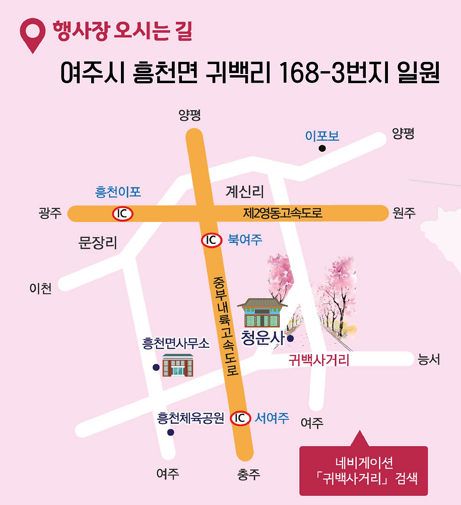 여주 벚꽃축제 행사장 위치는 여주시 흥천면 귀백리 168-3번지 일원입니다.