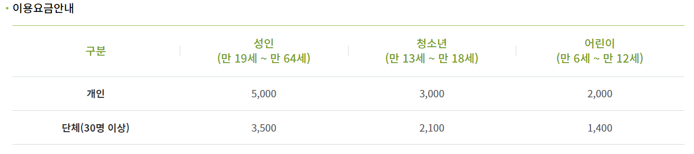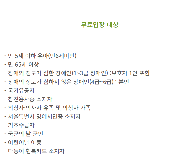 그 밖에 장애인, 국가유공자, 참전용사 등 서류 확인 후 무료입장됩니다.