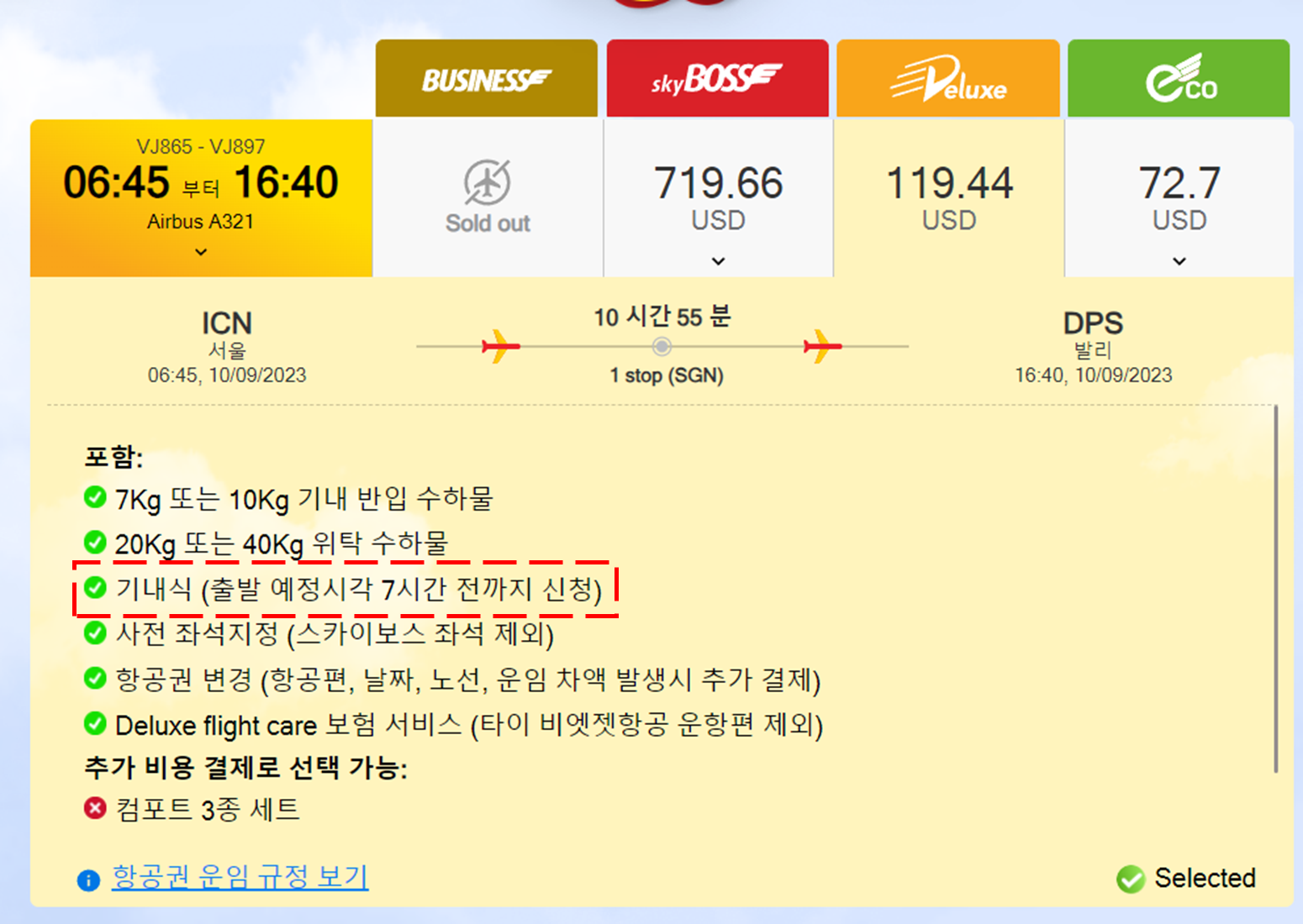 비엣젯항공 Deluxe/Eco 비상구자리 사전좌석지정, 기내식, 수하물