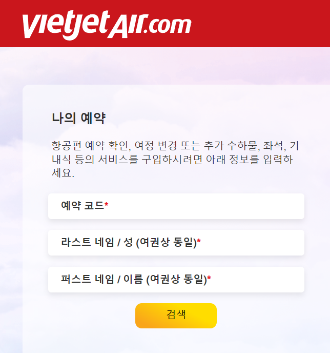 옵션을 변경하기 위해서는 우선 비엣젯 항공 공식 홈페이지에 들어가셔야 하고 예약번호와 성, 이름을 차례대로 넣습니다.