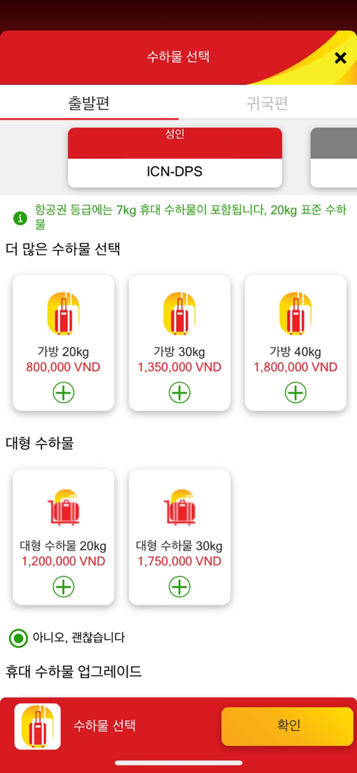제일 아래쪽에 수하물, 좌석, 식사, 우선체크인 등을 구매하기 위한 버튼이 나옵니다.