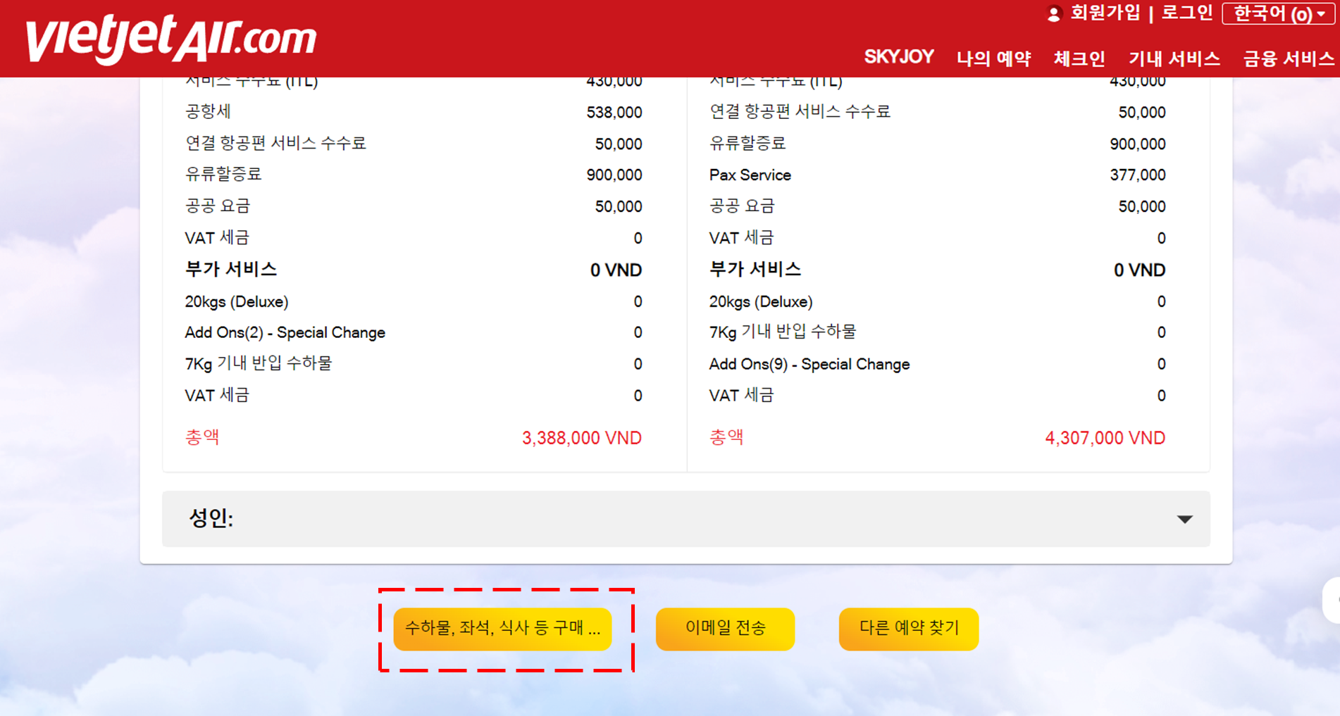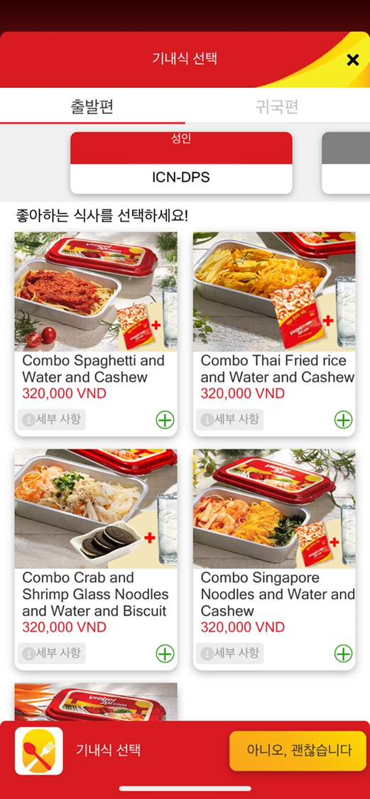 좌석을 선택하면서 기내식은 뭘 고를까 하고 보니, 기내식 선택 시에 32만 동을 지불하게 되어있더라고요!!