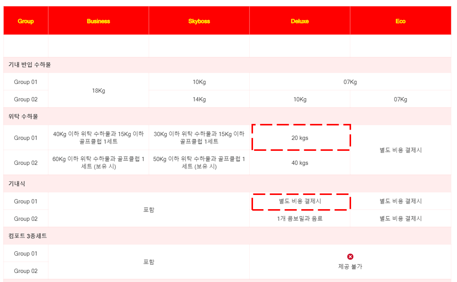 디럭스는 1그룹인 경우, 위탁수하물이  20kg 있지만, 에코는 위탁수하물이 전혀 없기 때문에 추가를 원하신다면,