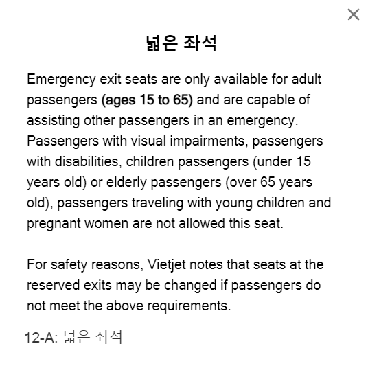 비상구 좌석을 선택 시, 15~65세 사이의 성인만 앉을 수 있다는 경고가 나옵니다.